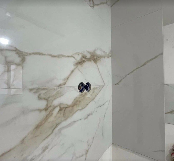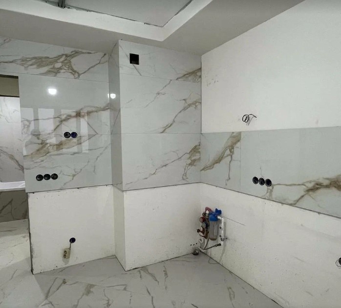 Грунтовка стен, укладка широкоформатного керамогранита, затирка швов