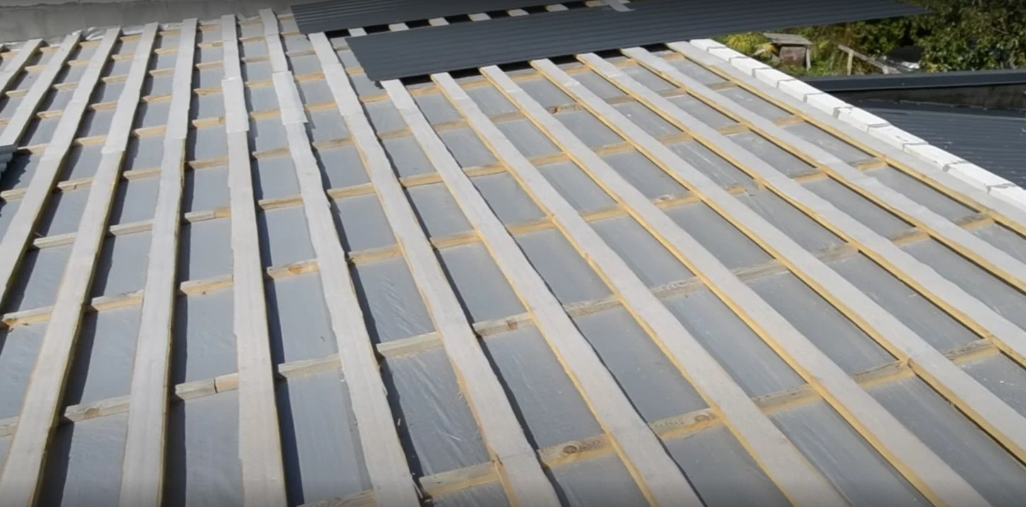 Монтаж кровли, материал - профнастил на односкатной кровле дома ХАЙТЭК.