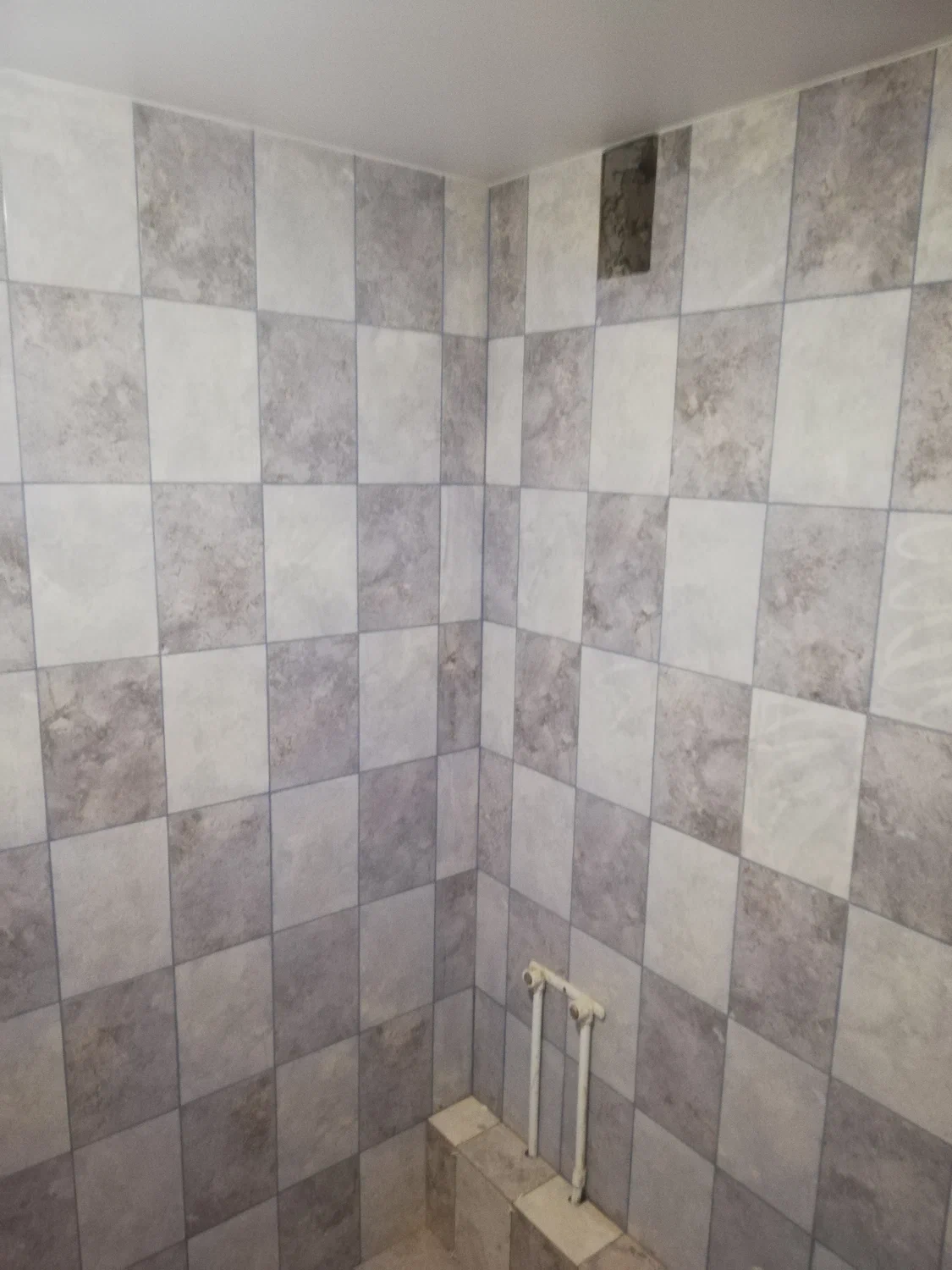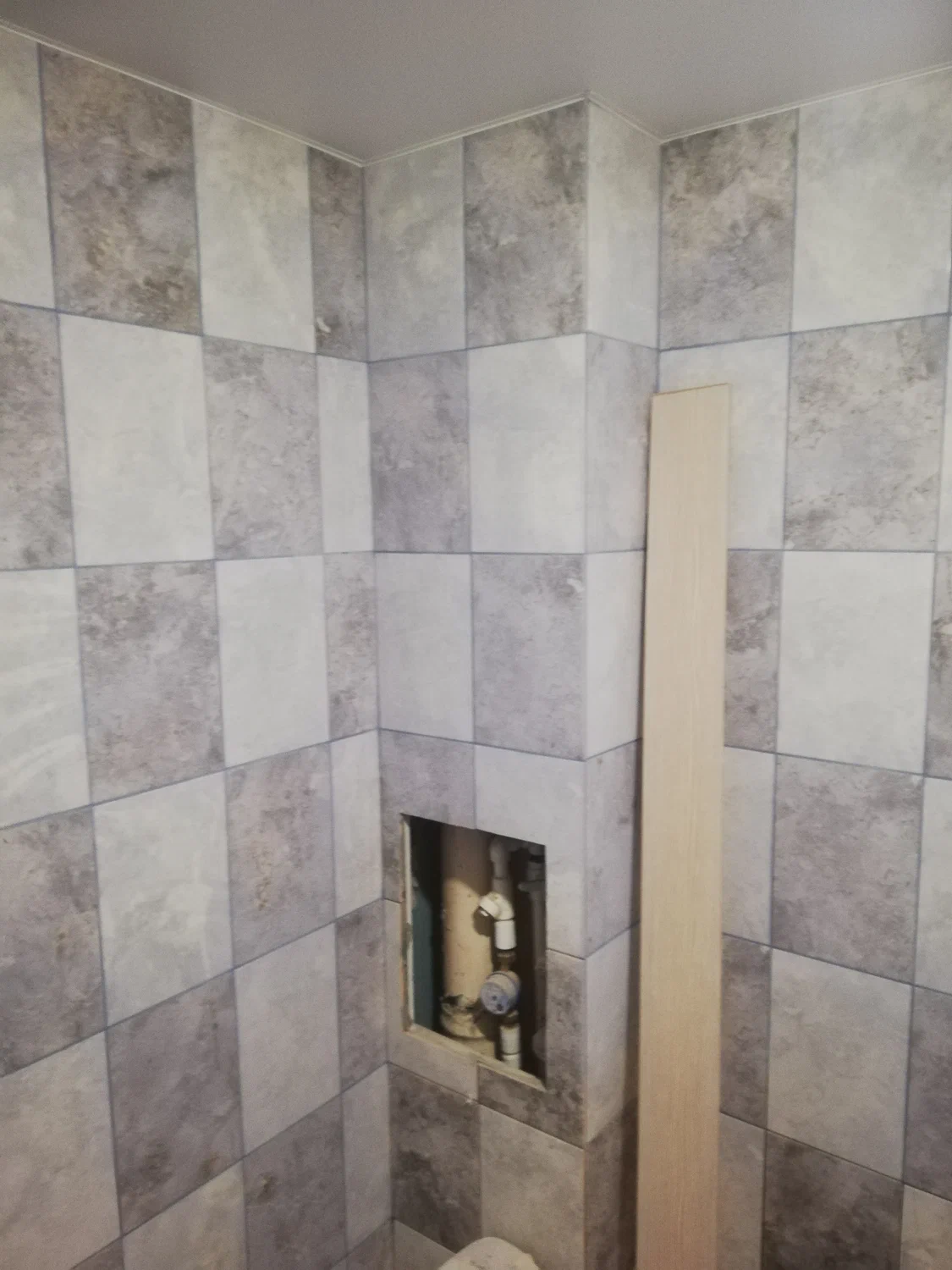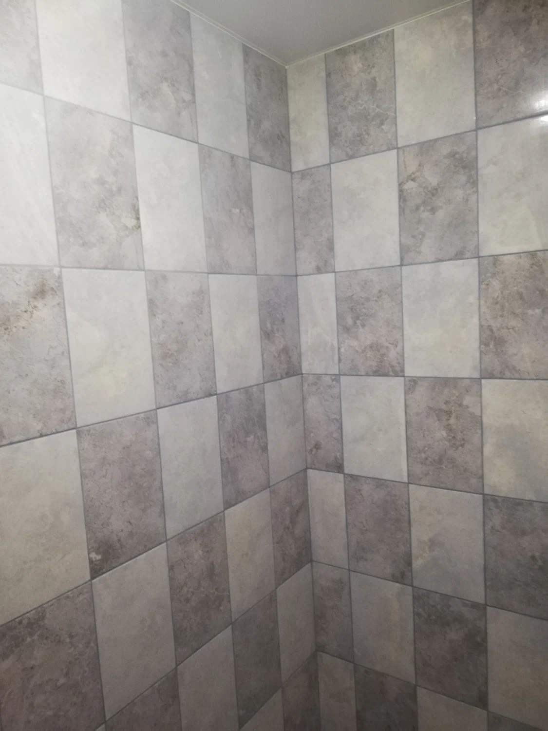 Оштукатурино по маякам углы 90° шахматная раскладка плитки.