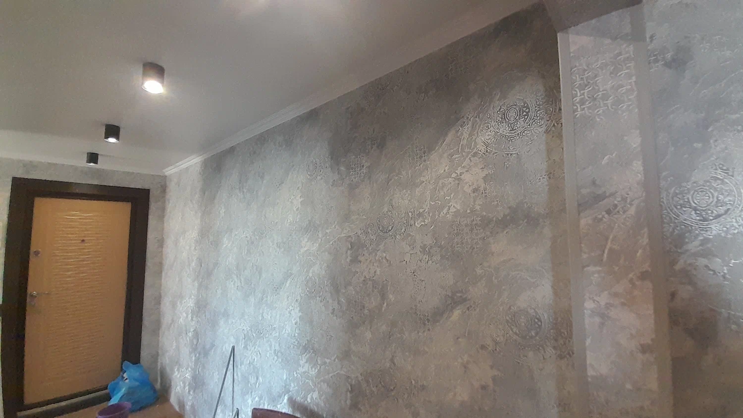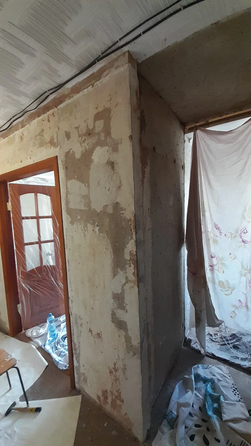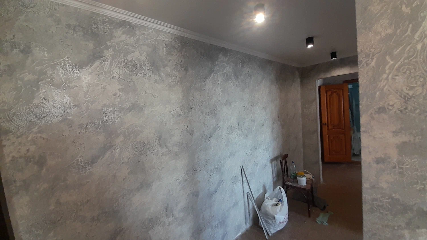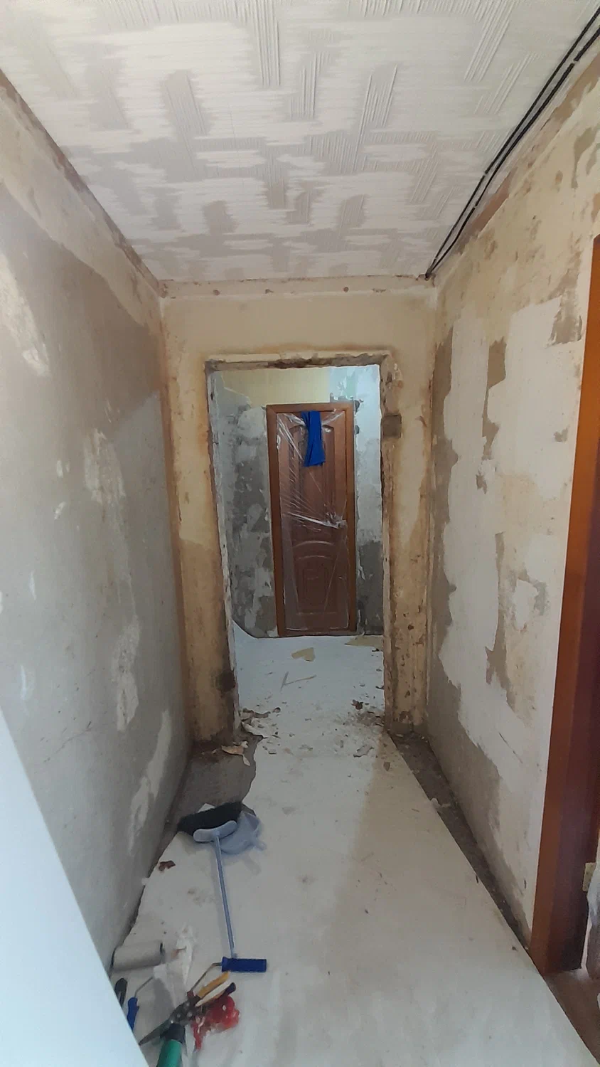 Площадь стен - 38,3 м2, частичная штукатурка, шпаклёвка, грунтование стен, наклейка обоев, потолочных плинтусов, пластиковых углов на проём.
