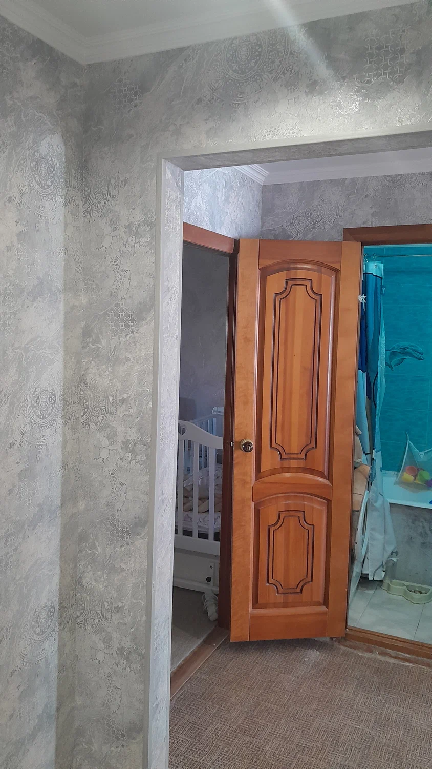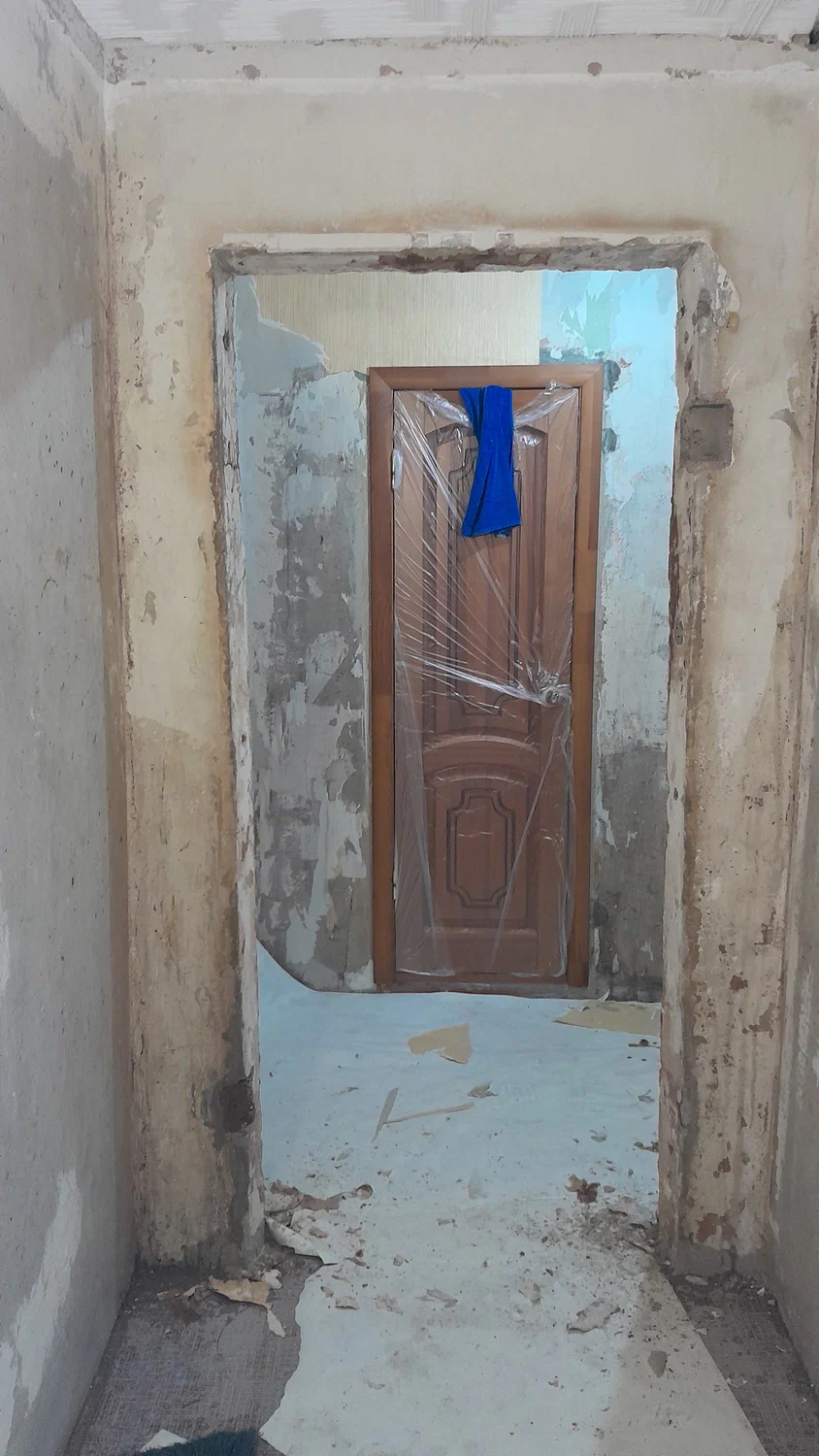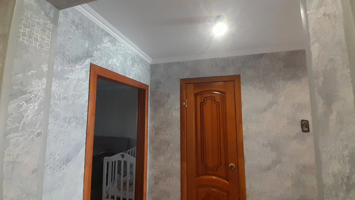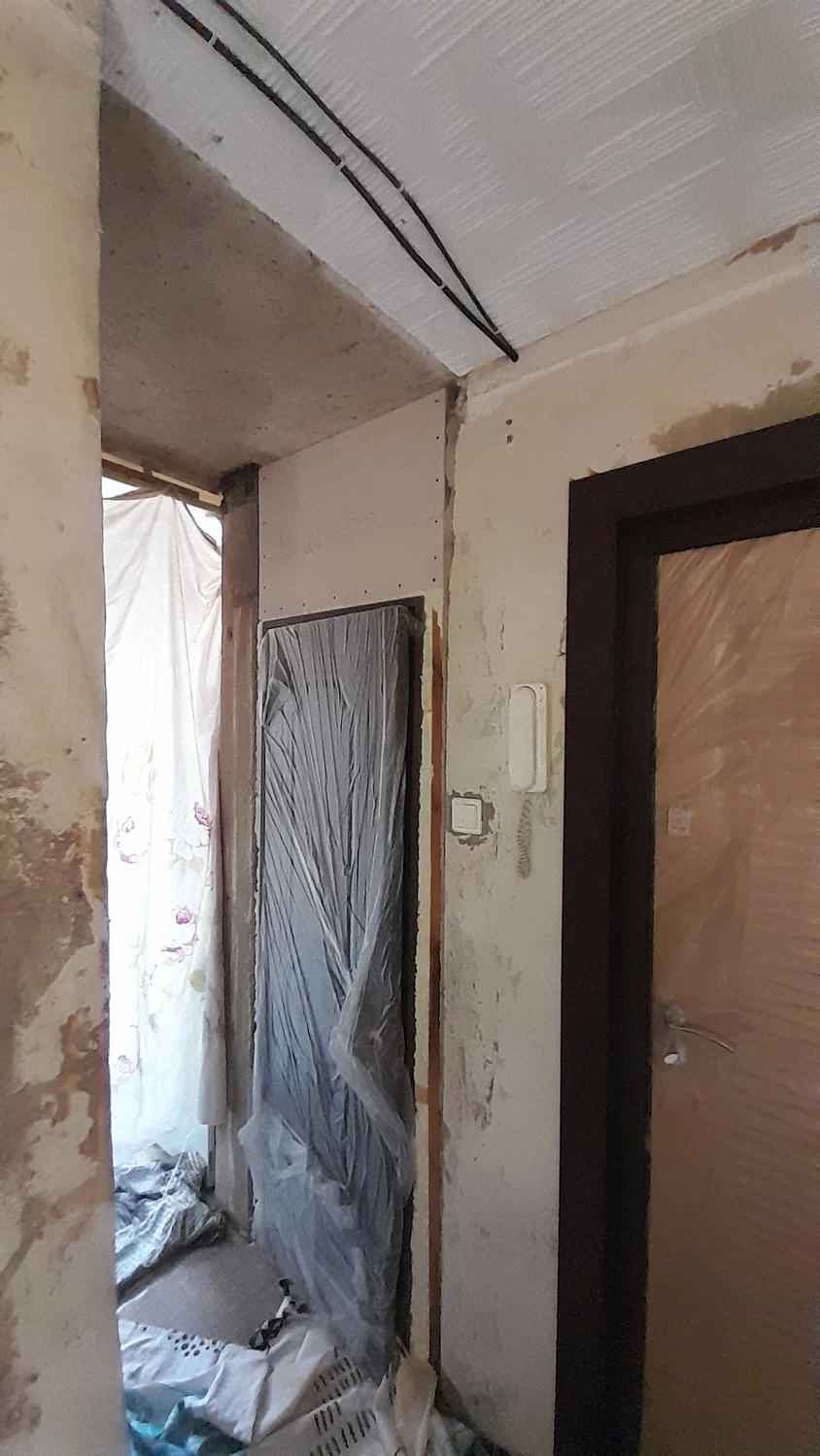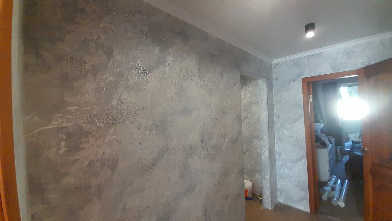 Площадь стен - 38,3 м2, частичная штукатурка, шпаклёвка, грунтование стен, наклейка обоев, потолочных плинтусов, пластиковых углов на проём.