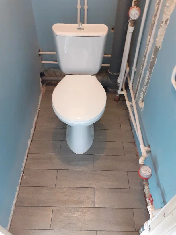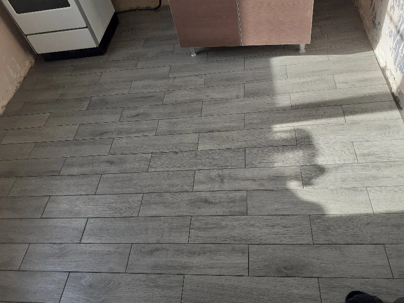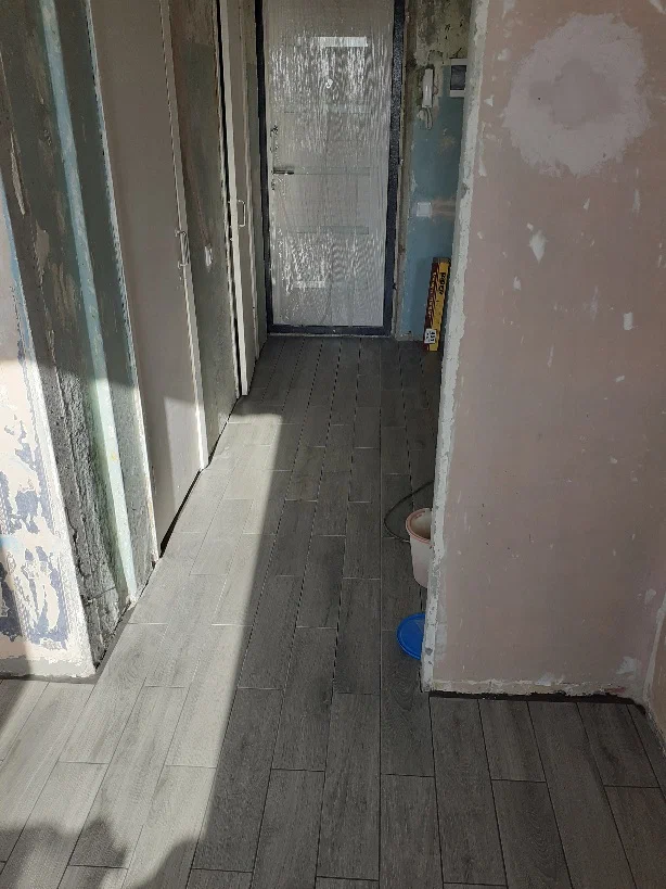 Выравнивание пола, укладка керамогранита в коридоре, кухне и туалете.