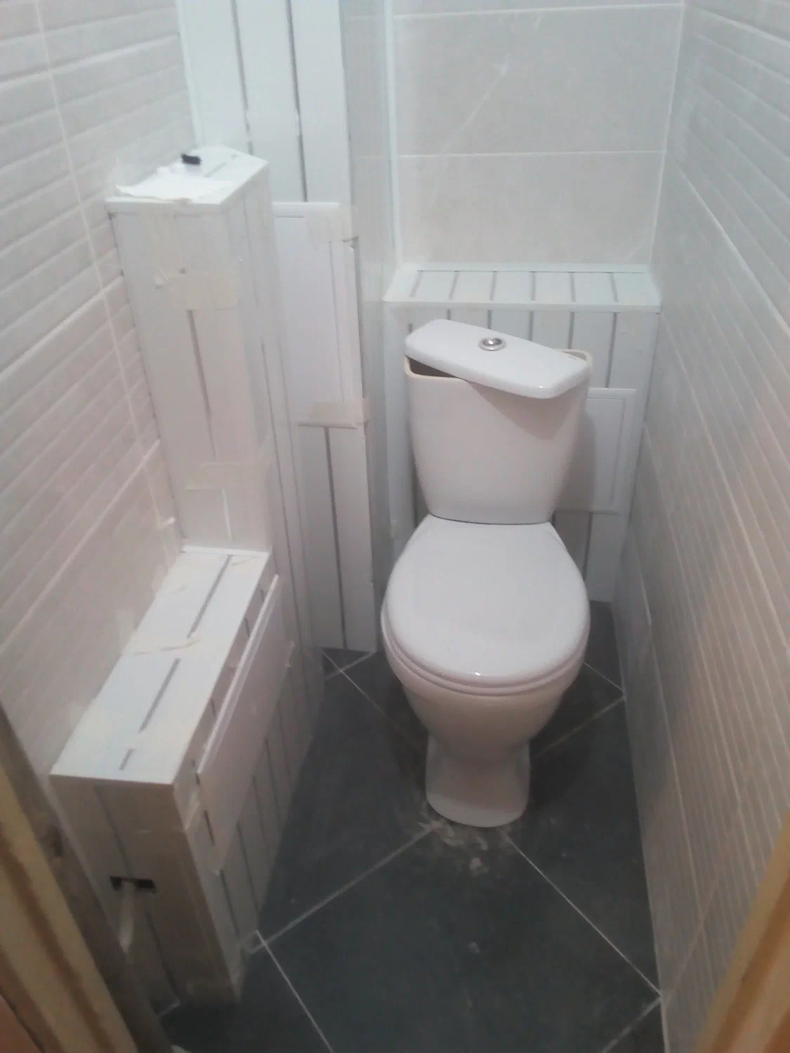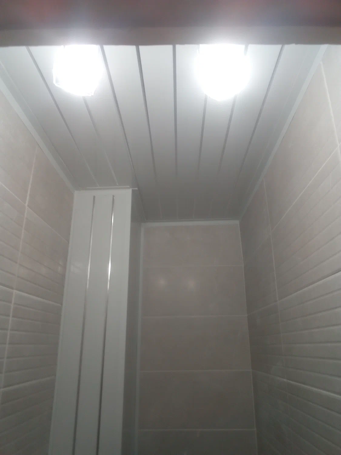 Укладка плитки, установка унитаза, закрытие коробом сантехники-ст панелями, укладка ст. Панелей на потолке.