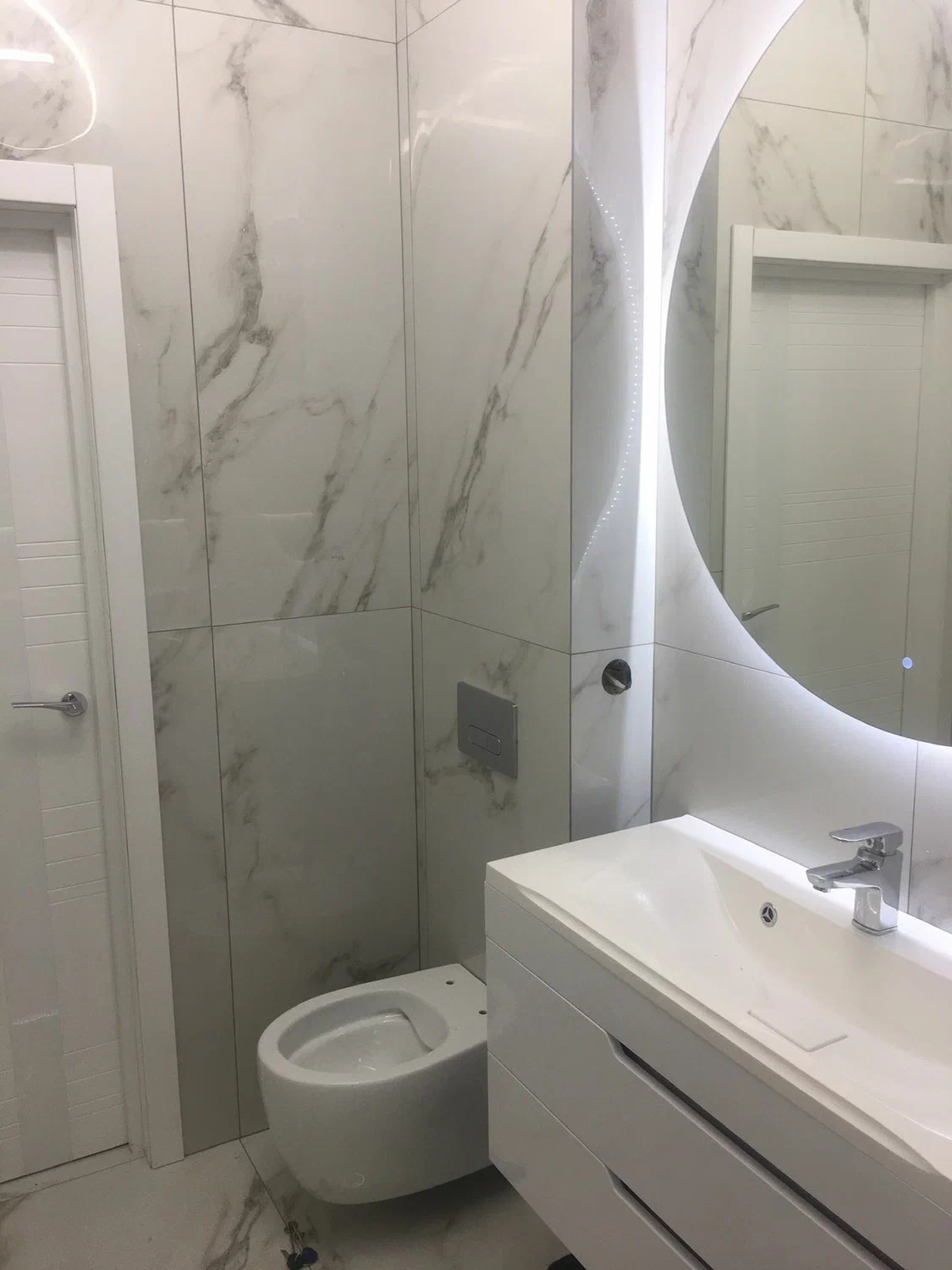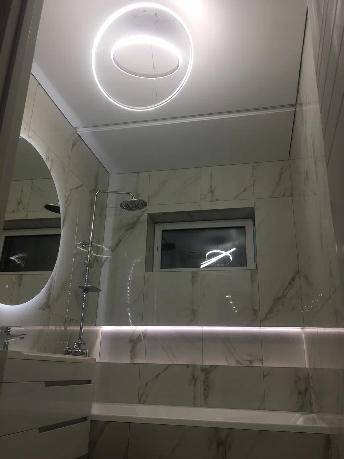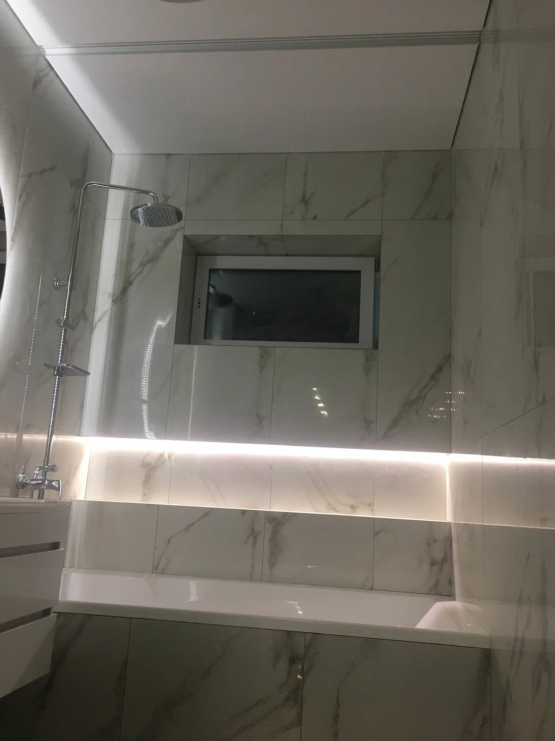 Выравнивание стен, укладка плитки, установка санфаянса, монтаж светодиодной ленты, монтаж двери, установка натяжного потолка.