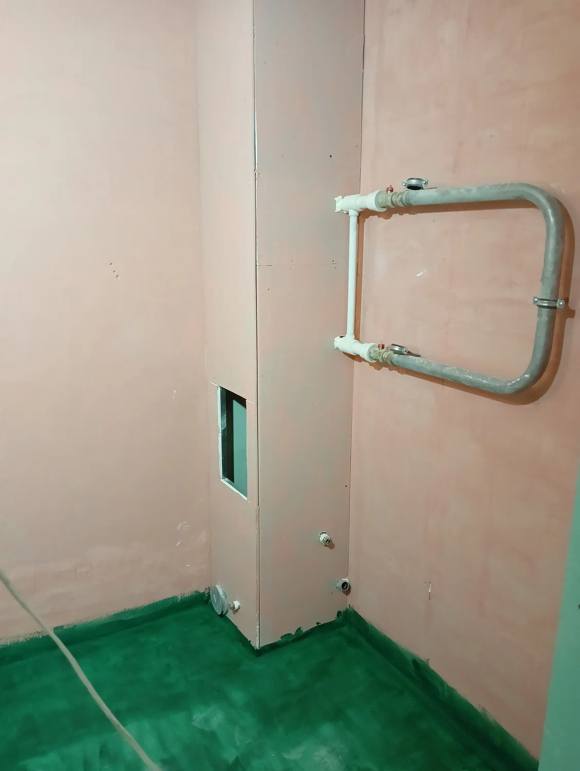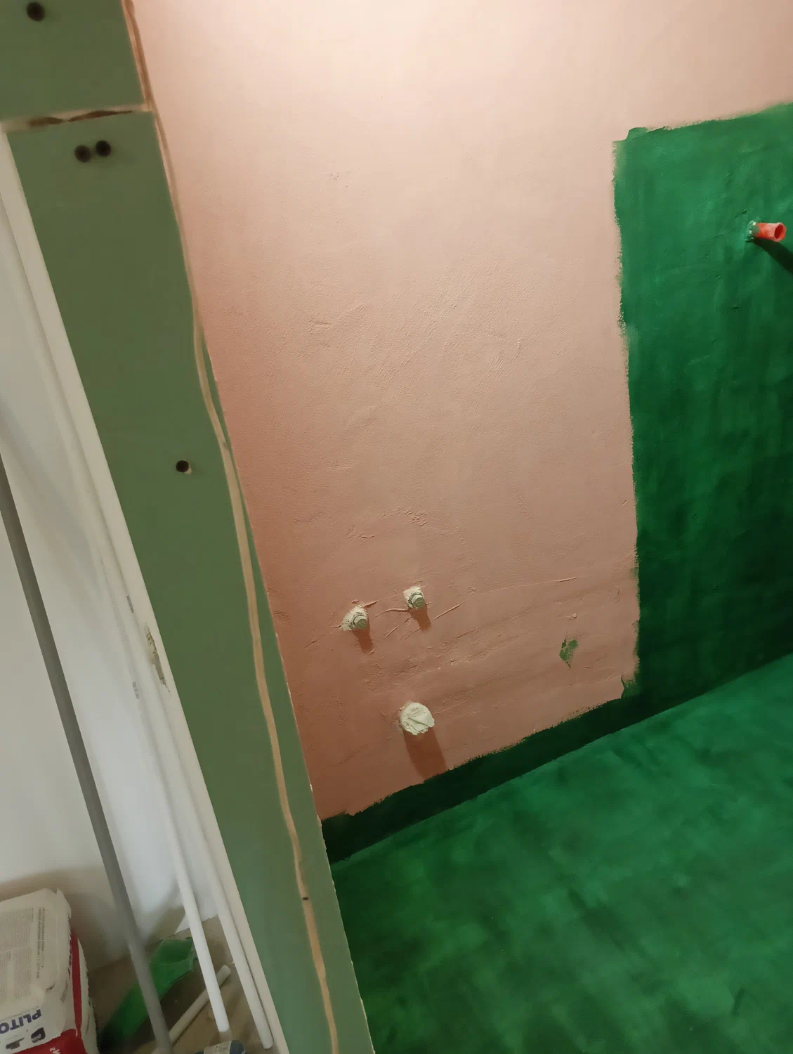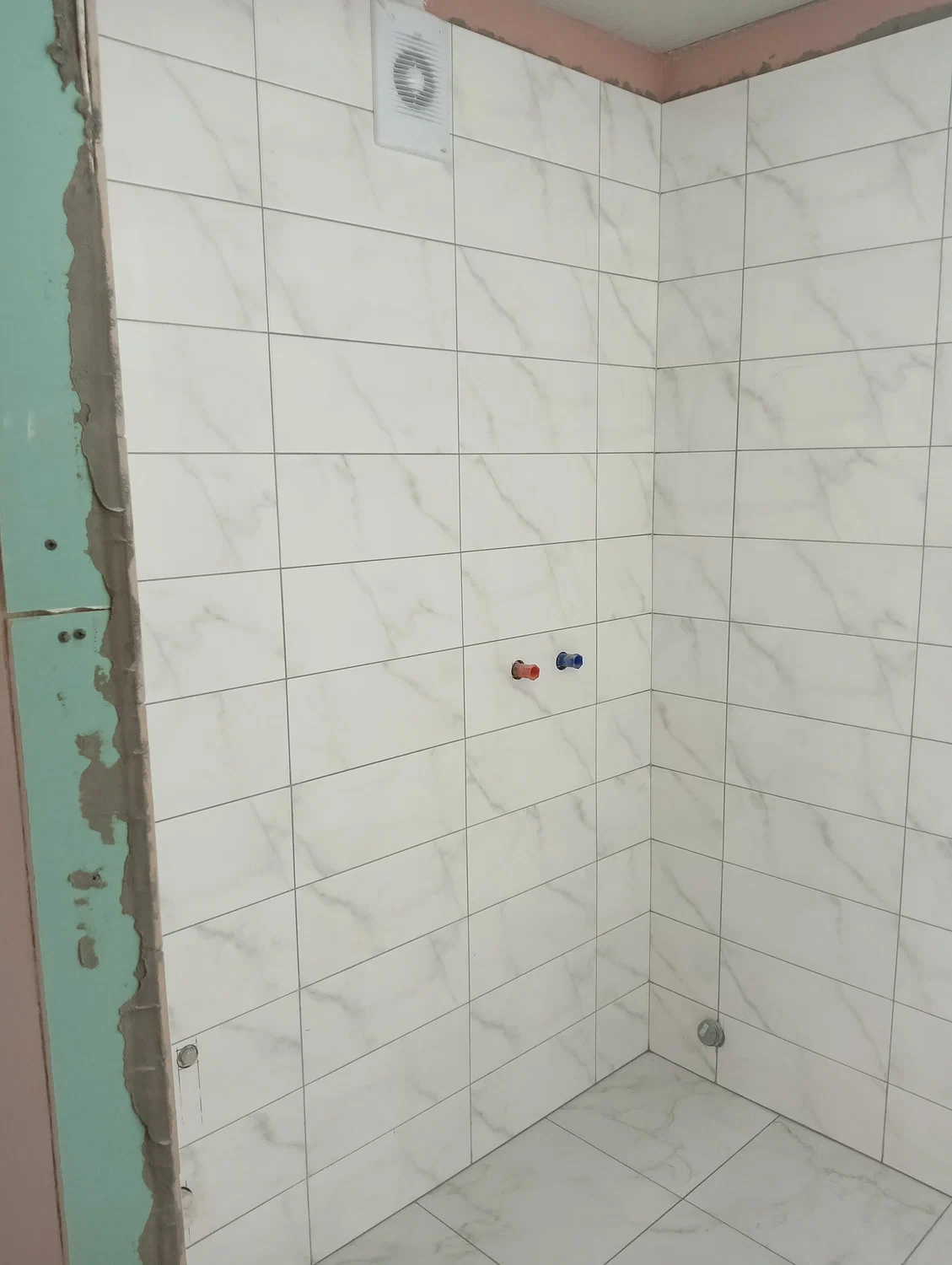 Выполнены следующие работы: штробление стен под воду и канализацию, разводка воды и канализации, заделка штроб, монтаж короба, грунтовка, нанесение бетонконтакта и гидроизоляции, укладка плитки, затирка швов, установка сантехники.