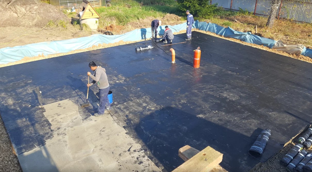 земляные работы (устройство котлована), укладка геотекстиля, устройство песчанно гравийной подушки, устройство бетонной подготовки, гидроизоляция оклеечная в 2 слоя, установка опалубки, армирование фундаментной плиты, бетонирование ф.п.