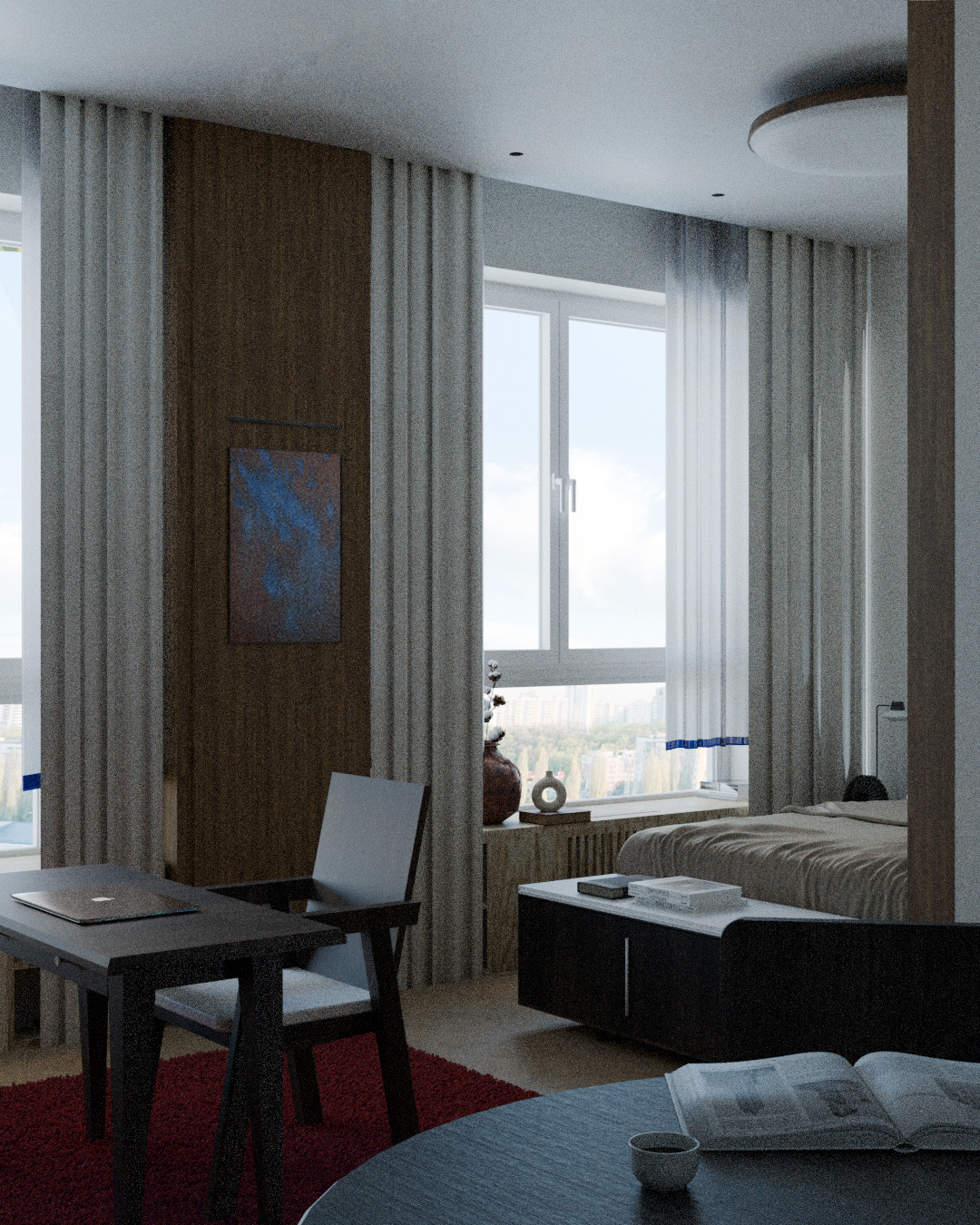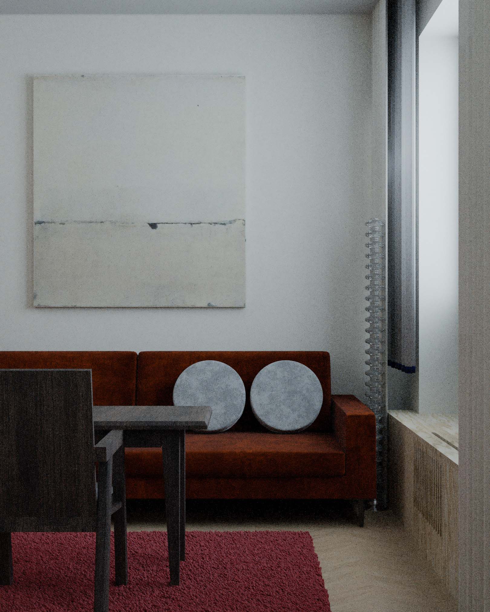 Интерьер создавался по мотивам впечатлений поездки к другу в Сибирь.